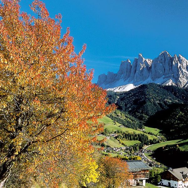 The Villnöss valley has got a special scenic beauty. Hardly in another location you can find such a sudden transition from gentle low mountain terraces to high alpine mountain landscapes like here. While on the slopes in the valley the wine thrives, the peaks behind already wear their wintry dress. A sightseeing building in St. Peter’s district is the parish church with its more than 60 meters high, striking onion dome. The church is also known as “Dom in the valley” due to its imposing appearance. During your stay in Villnöss in St. Magdalena’s district you will get romantic impressions of the mountain world in the Dolomites Together with the old schoolhouse and the Mesnerhaus the church is one the most popular photo subject with the Geisler peaks in the background.